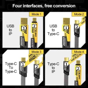 + Free Shipping?Quad Max, 4 in 1 Cable?Super Sturdy, Super Stylish: A super sturdy and strong version of our #1 selling 4 in 1 cable. This cable features Zinc Alloy connectors with a unique mechanism when youre changing modes. A flat nylon braided cable. 3.3ft of length, 65W charging capacity. This is your most rugged, most durable, most stylish charging best friend! ?65W of Power Delivery? The Quad Max supports upto 65W (PD Power only) of power transmission perfect to charger for laptops, macbooks and of course even iPhones, Samsungs, Pixels, iPads. ?Durable Materials?The New India cables are made of zinc alloy, with a strength increase of 500% and resistance to dropping.The cable is protected by high-strength nylon woven material, ensuring excellent quality for your user experience. ?High-Speed Data Transfers?: Transfer movies, music, or more in seconds with 480 Mbps transfer speeds. ?Charge Without Taking Case off?: Our intentional 2mm connector extension design enables easy charging without removing your case and protects both USB-C and Fast-charging connectors.